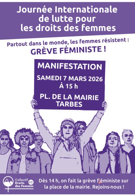 L'équipe d'animation du CDDF65 vous donne rendez-vous samedi 7 mars 2026, Place Jean-Jaurès (mairie) dès 14h pour la grève féministe et à partir de 15h pour le départ en manifestation.